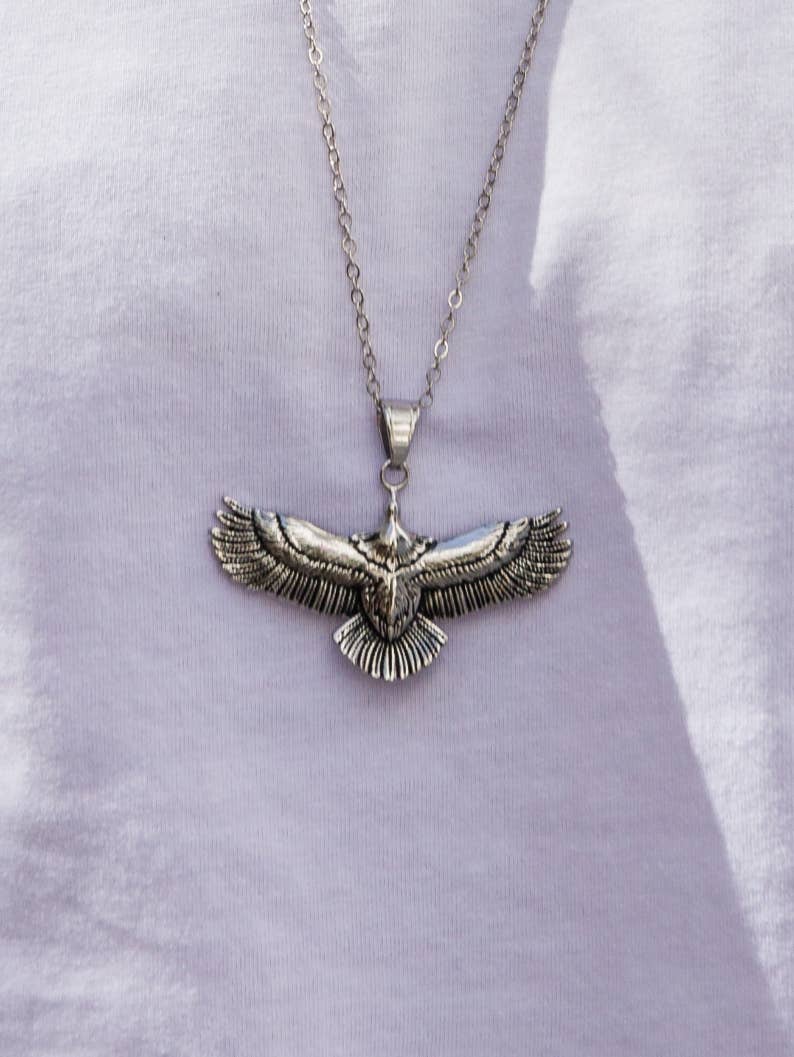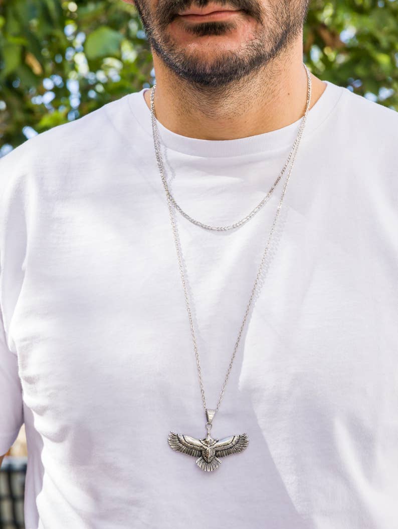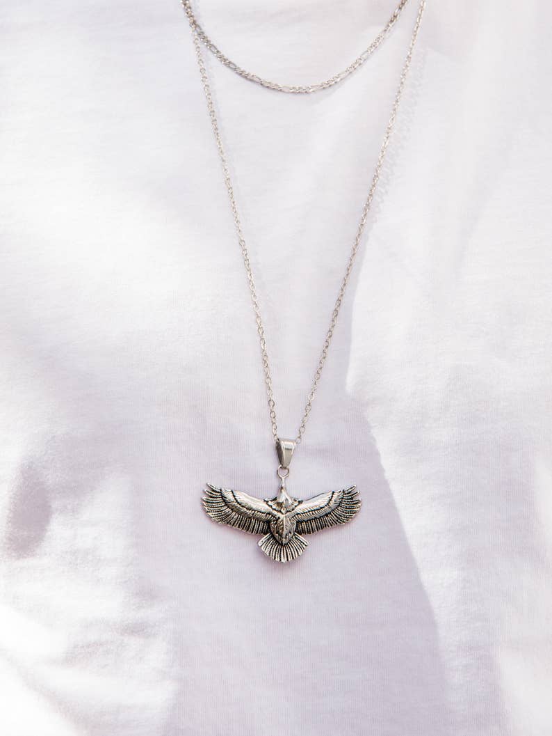 Eine einzigartige Kette mit einem einzigartigen Adler in der Mitte, die aus Edelstahl gefertigt ist und durch eine silberne Edelstahlkette geführt wird. MATERIALIEN - Anhänger und Kette aus Edelstahl. ABMESSUNGEN - Adler-Anhänger: 45 x 62 cm (17,7" X 24,4 „)