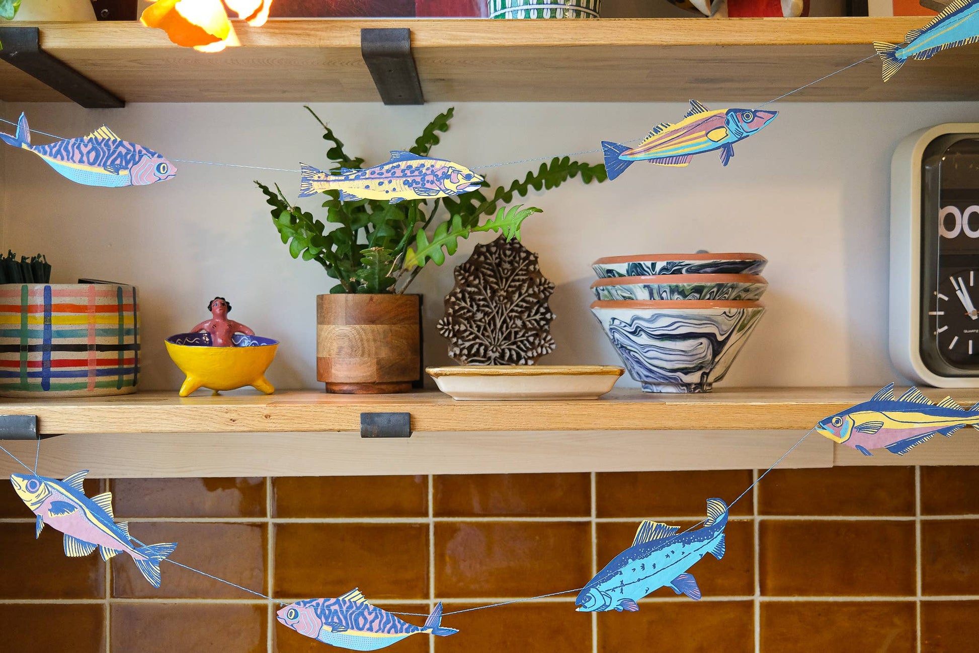 Mit zehn bunten Flussfischen ist dies eine der ersten Girlanden, die East End Press je hergestellt hat, und aus gutem Grund bleibt sie ein Bestseller! 3 Meter lang - Enthält 10 Papierformen, die entlang eines starken Baumwollfadens genäht sind - Von talentierten Kunsthandwerkern in Jaipur beidseitig von Hand im Siebdruckverfahren bedruckt - Nachhaltig aus recycelten Materialien hergestellt