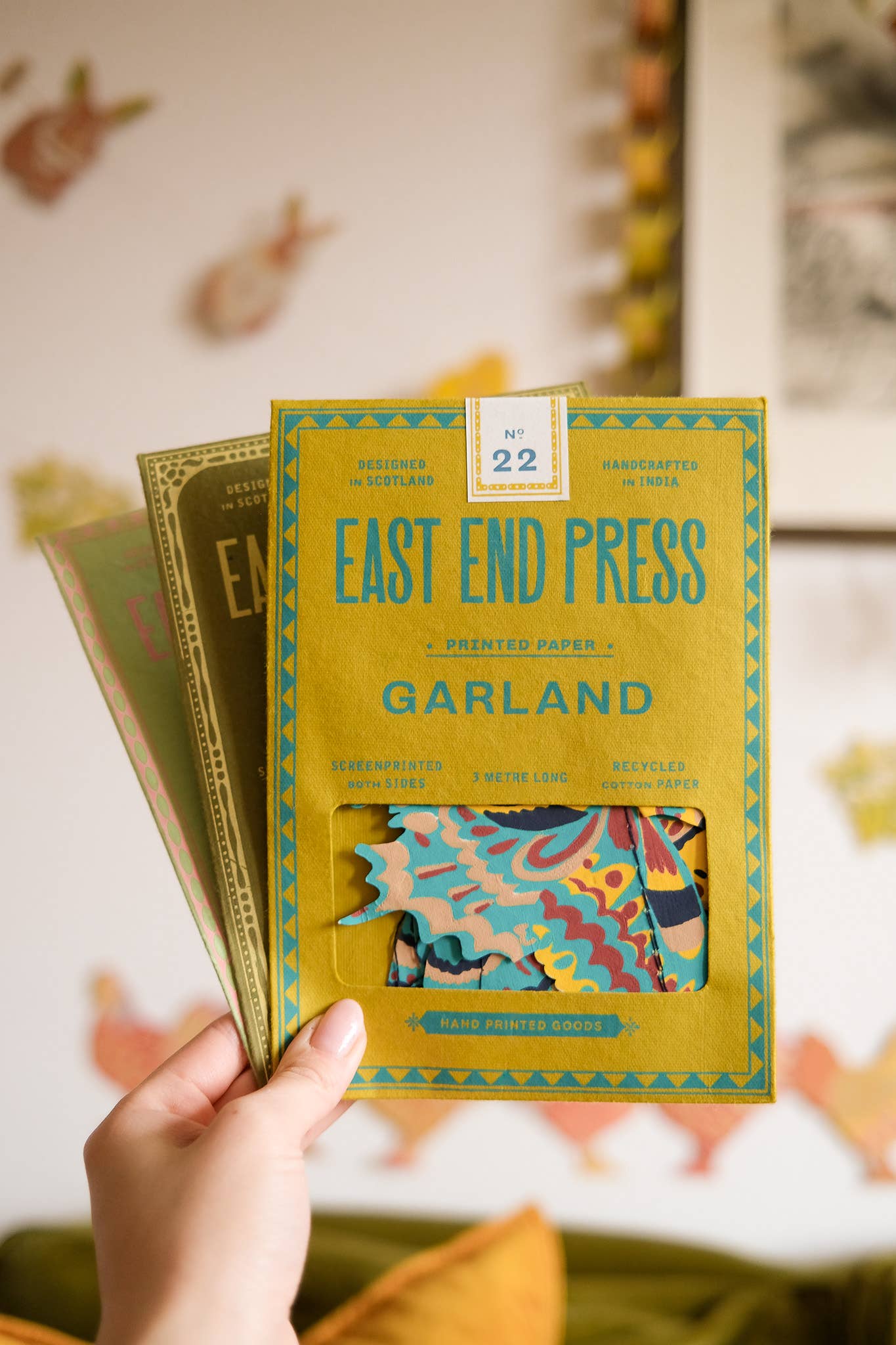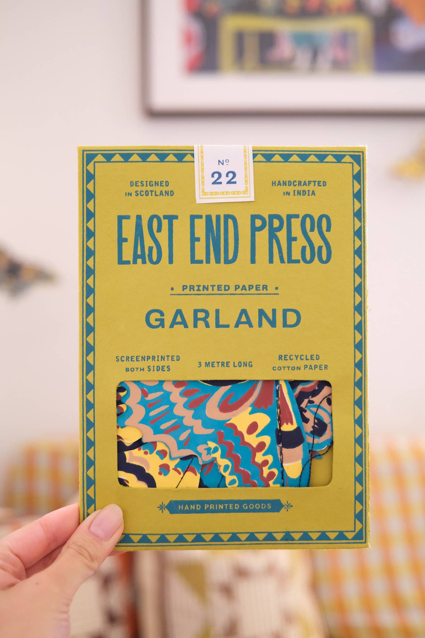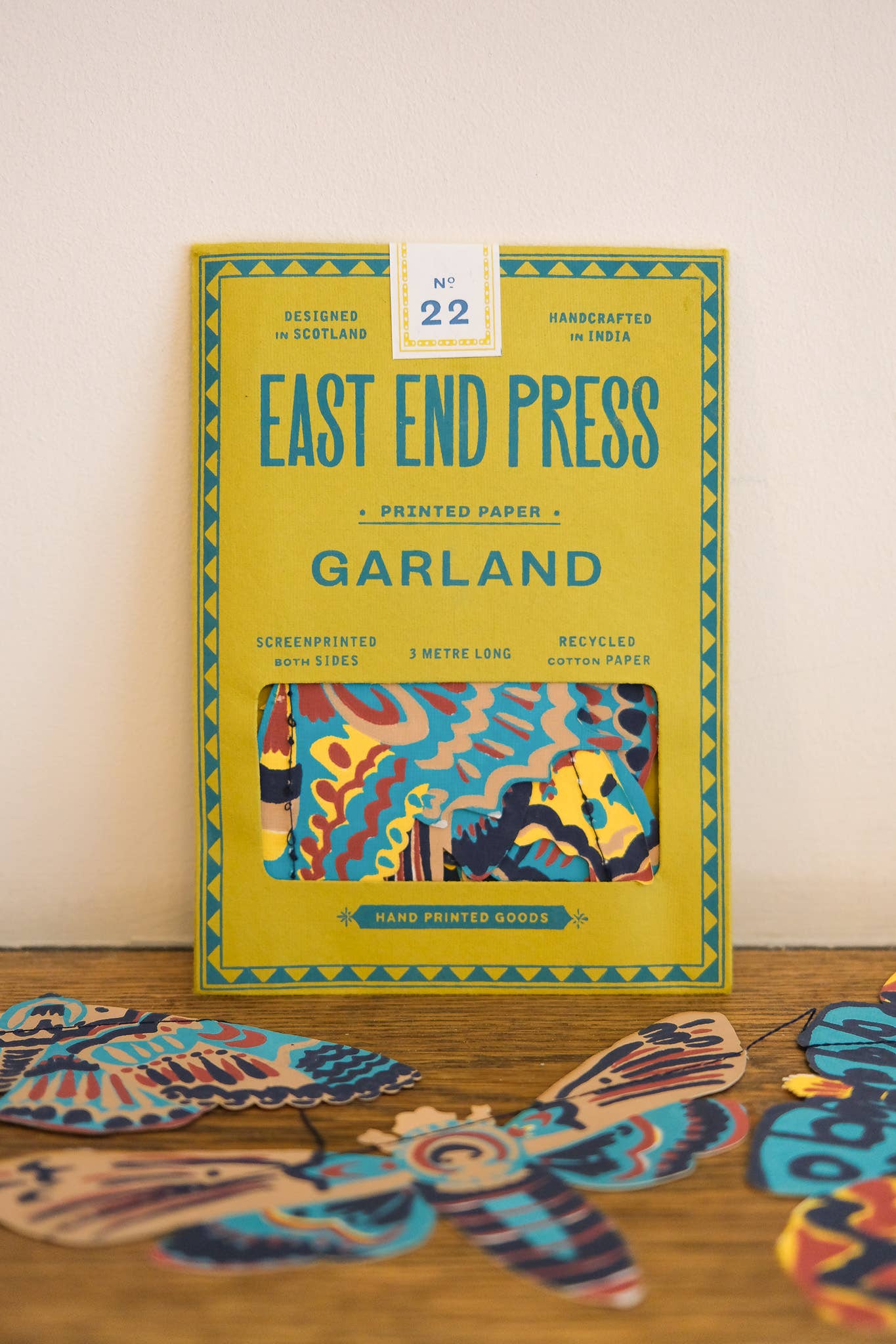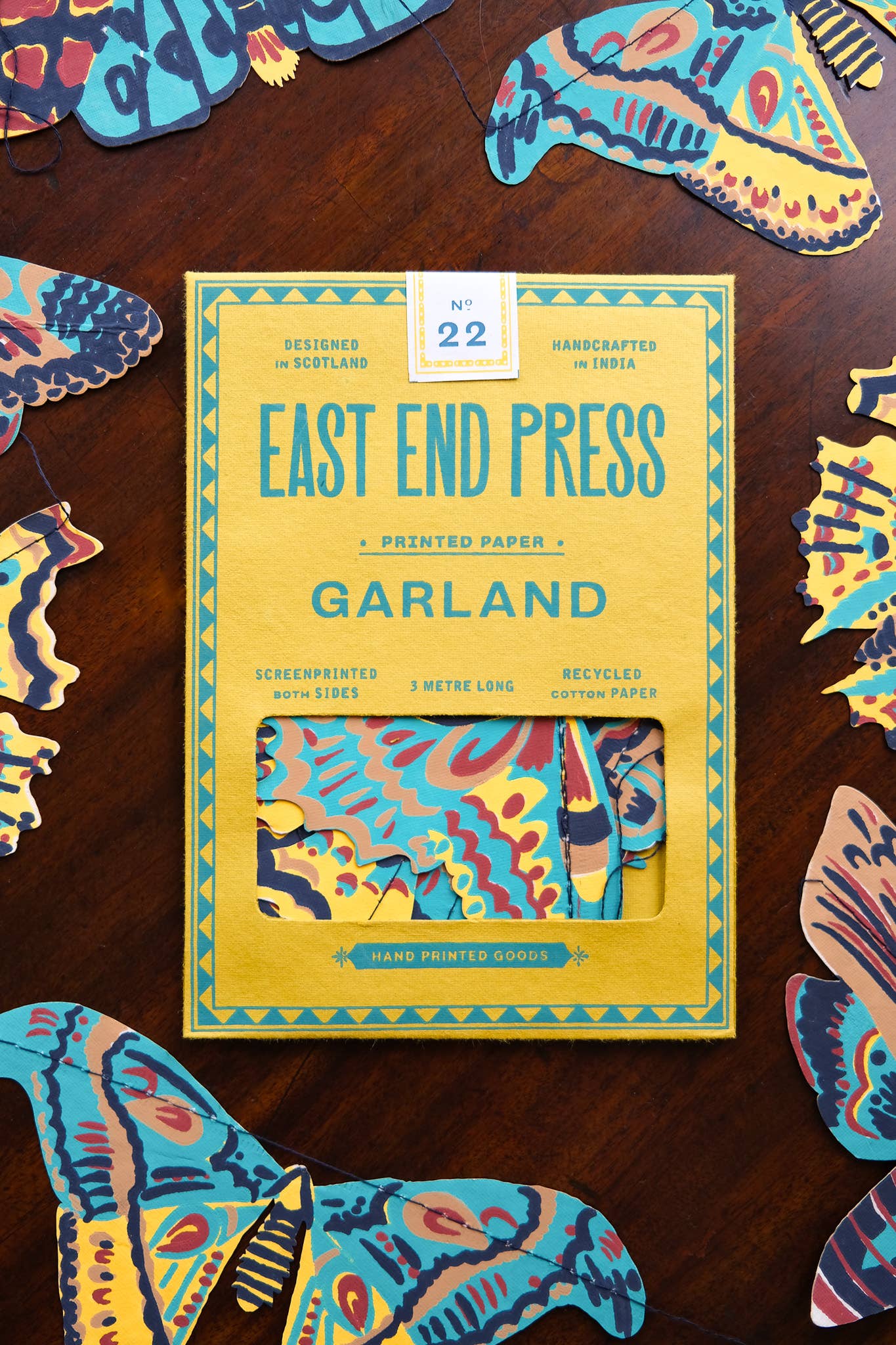 Zehn große britische Motten bilden diese Girlande, jede mit gemusterten, bunten Flügeln, bereit, über Ihre Wände zu fliegen! 3 Meter lang - Beinhaltet 10 Papierformen, entlang eines starken Baumwollfadens genäht - Von talentierten Kunsthandwerkern in Jaipur beidseitig von Hand im Siebdruckverfahren bedruckt - Nachhaltig aus recycelten Materialien hergestellt