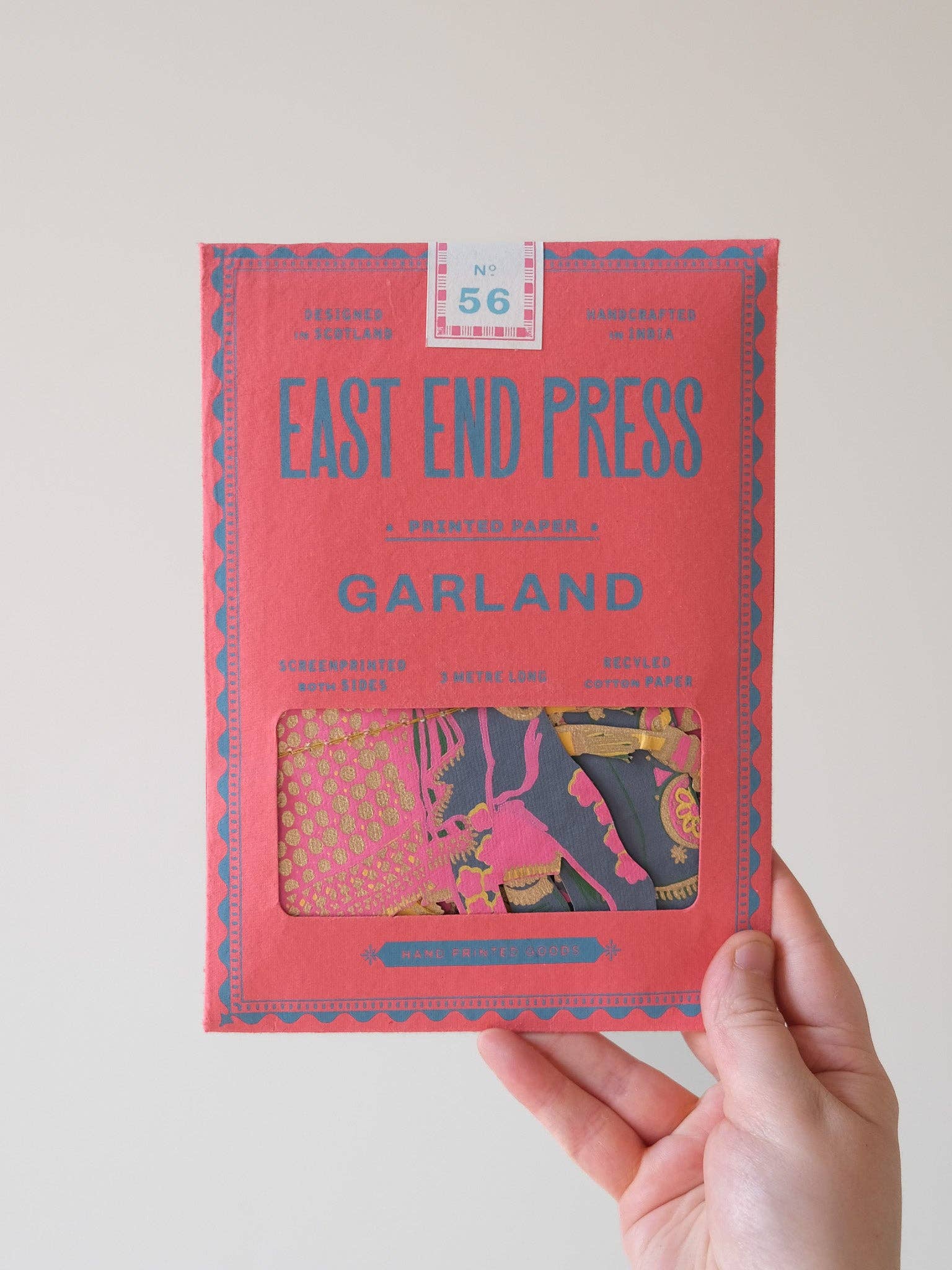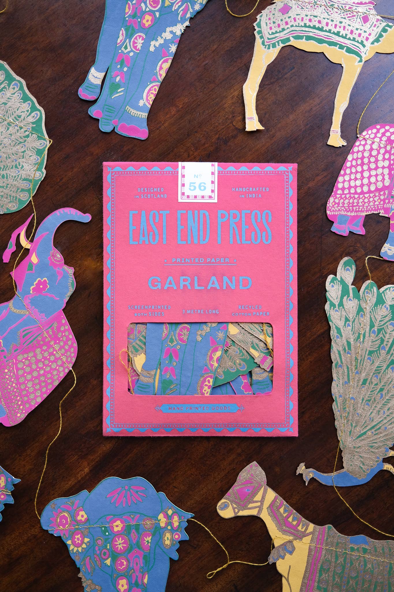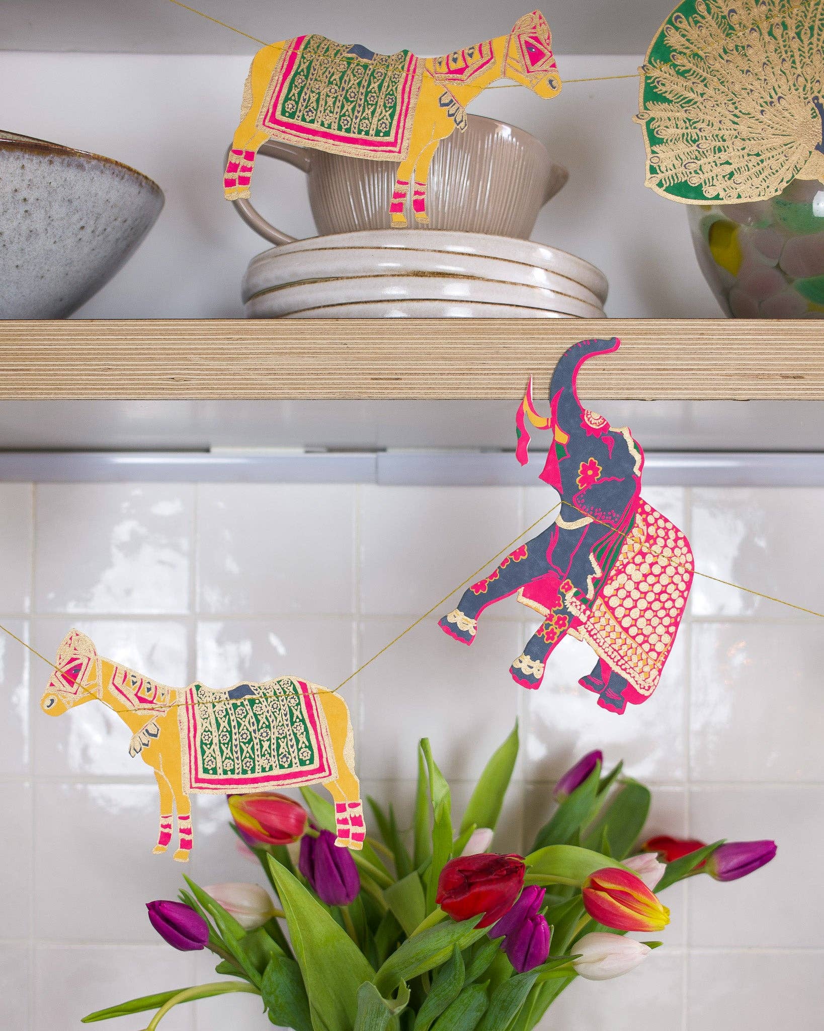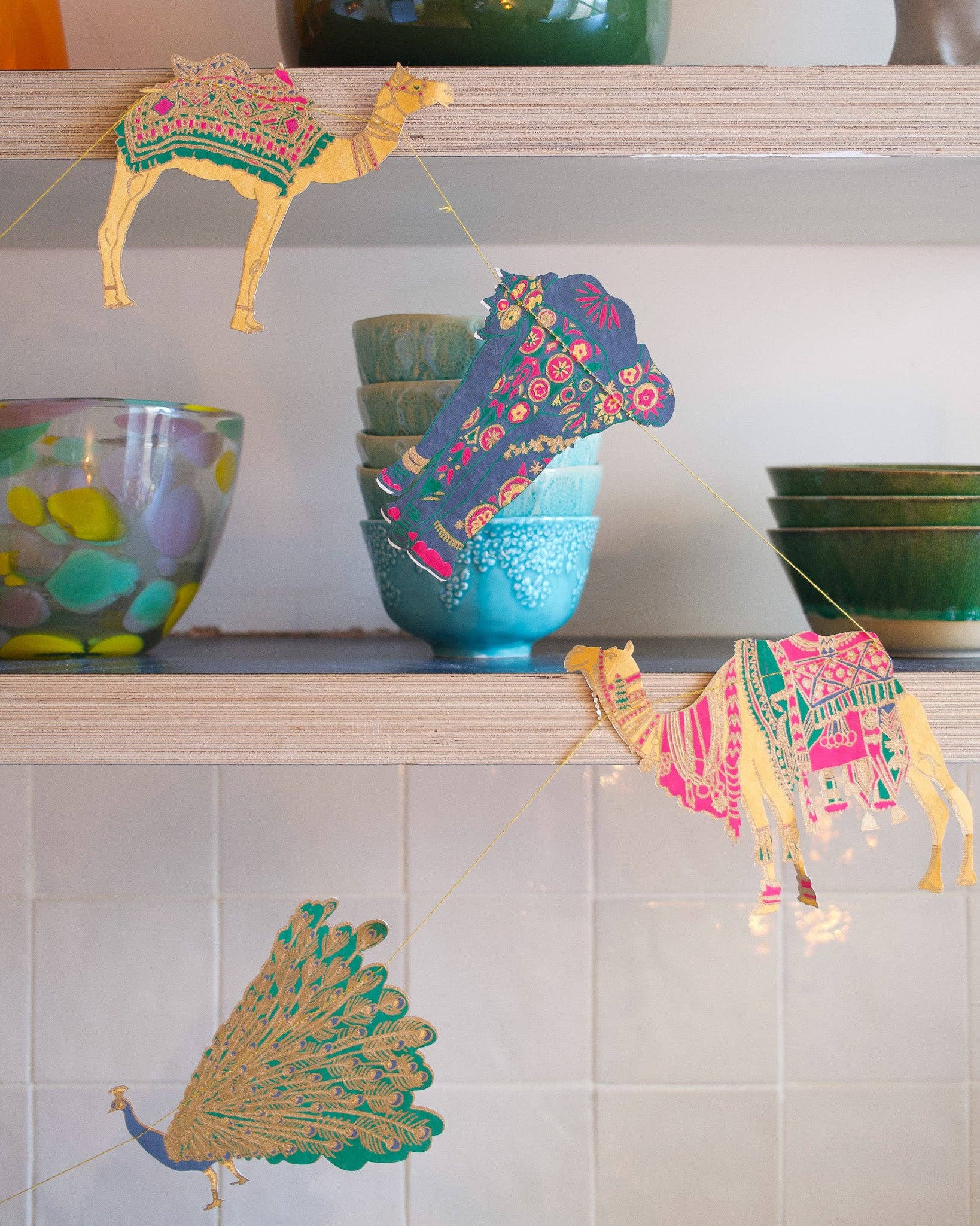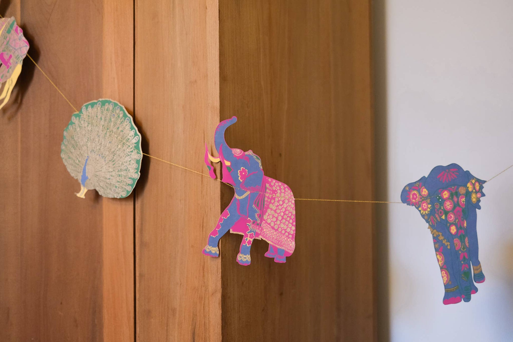 Mit bemalten Elefanten, prächtigen Kamelen, tänzelnden Pfauen und geschmückten Pferden; diese Girlande ist eine Menagerie schöner indischer Tiere. 3 Meter lang - Enthält 10 Papierformen, entlang eines starken Baumwollfadens genäht - Beidseitig von talentierten Kunsthandwerkern in Jaipur von Hand im Siebdruckverfahren bedruckt - Nachhaltig aus recycelten Materialien hergestellt