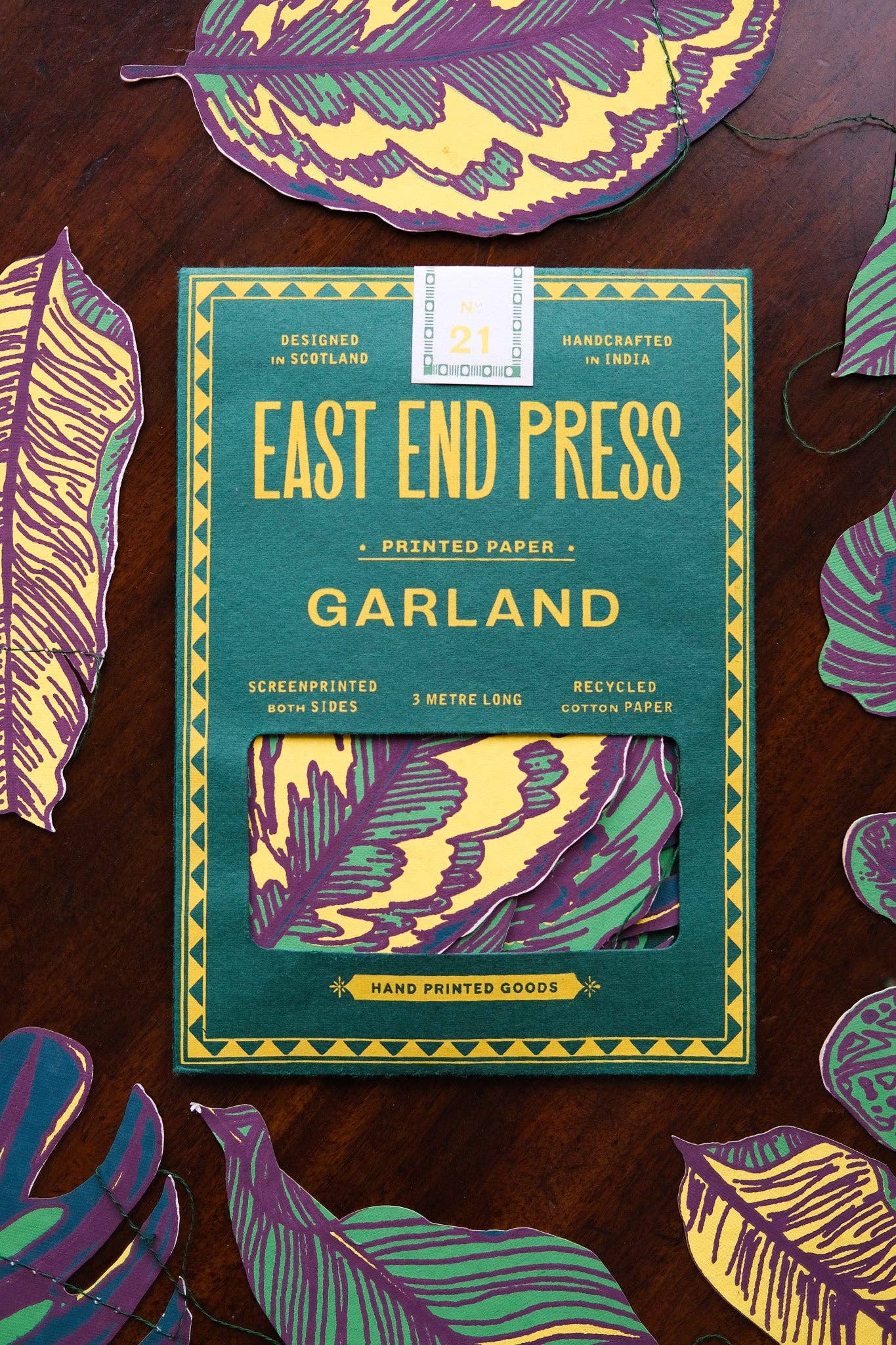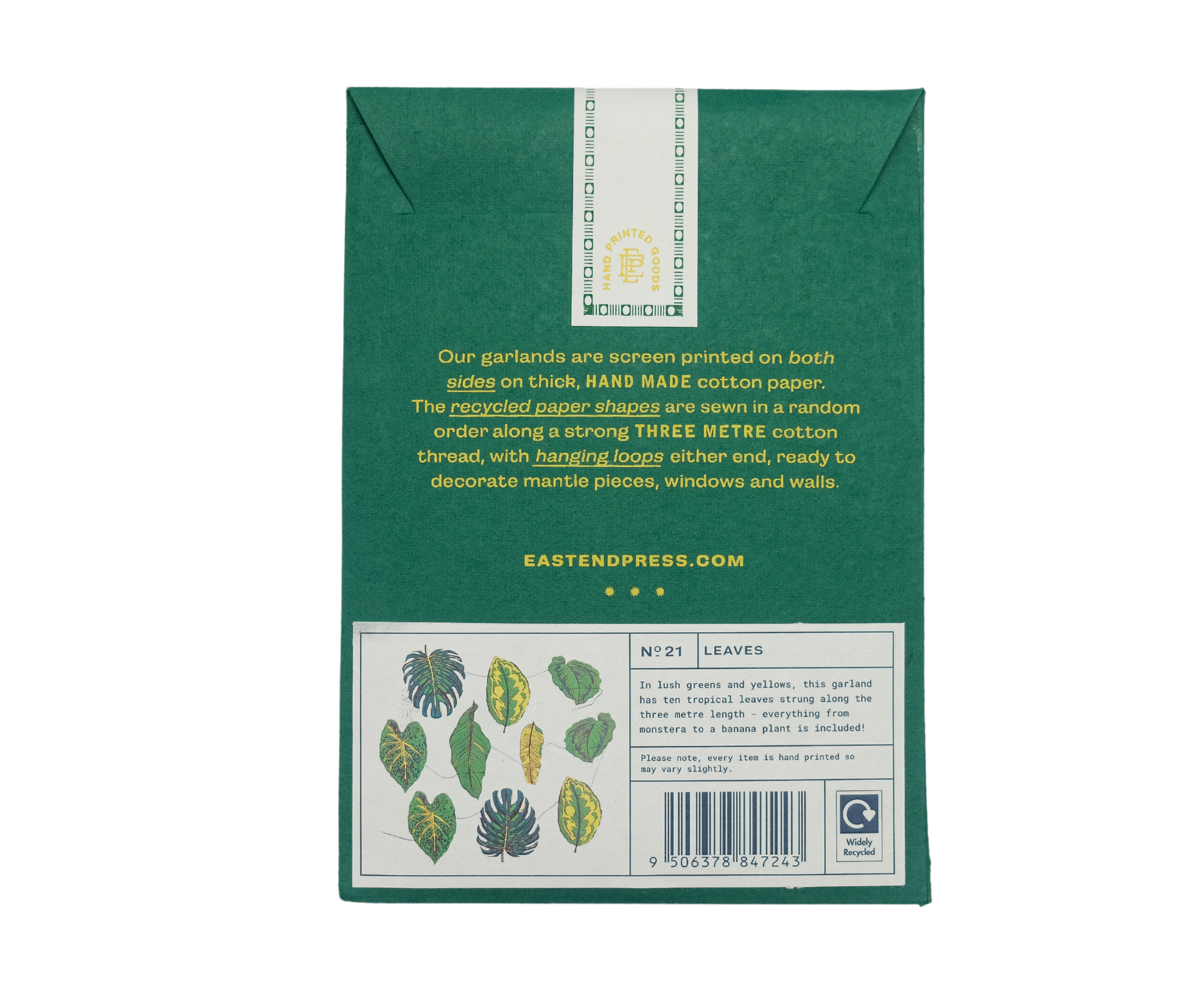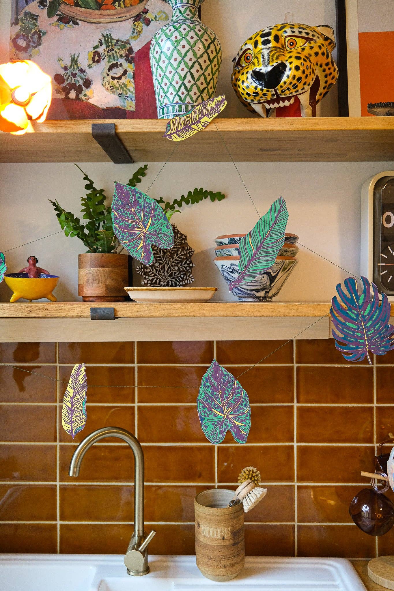 In sattem Grün und Gelb hat diese Girlande zehn tropische Blätter entlang der drei Meter langen Schnur - alles von Monstera bis zur Bananenpflanze ist enthalten!