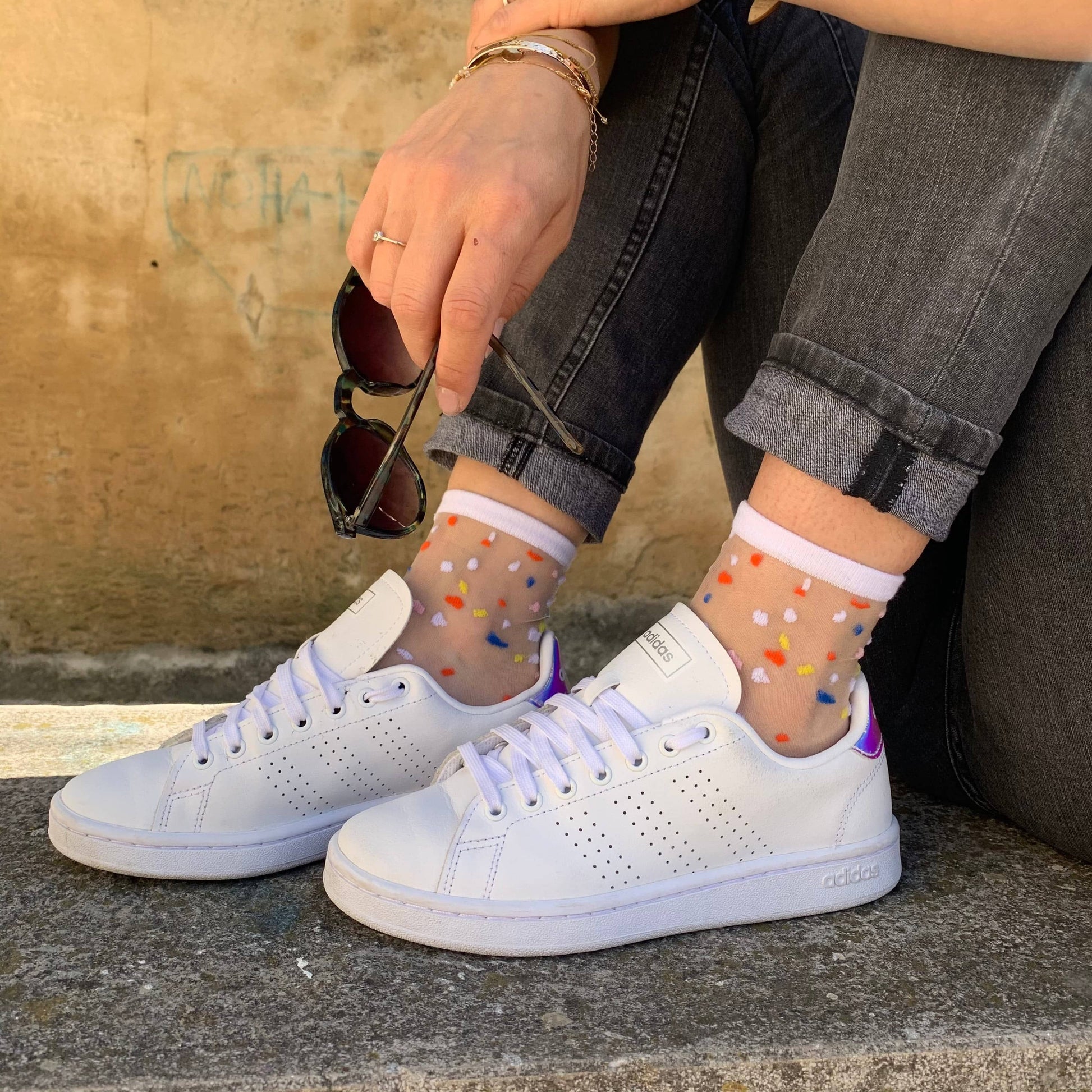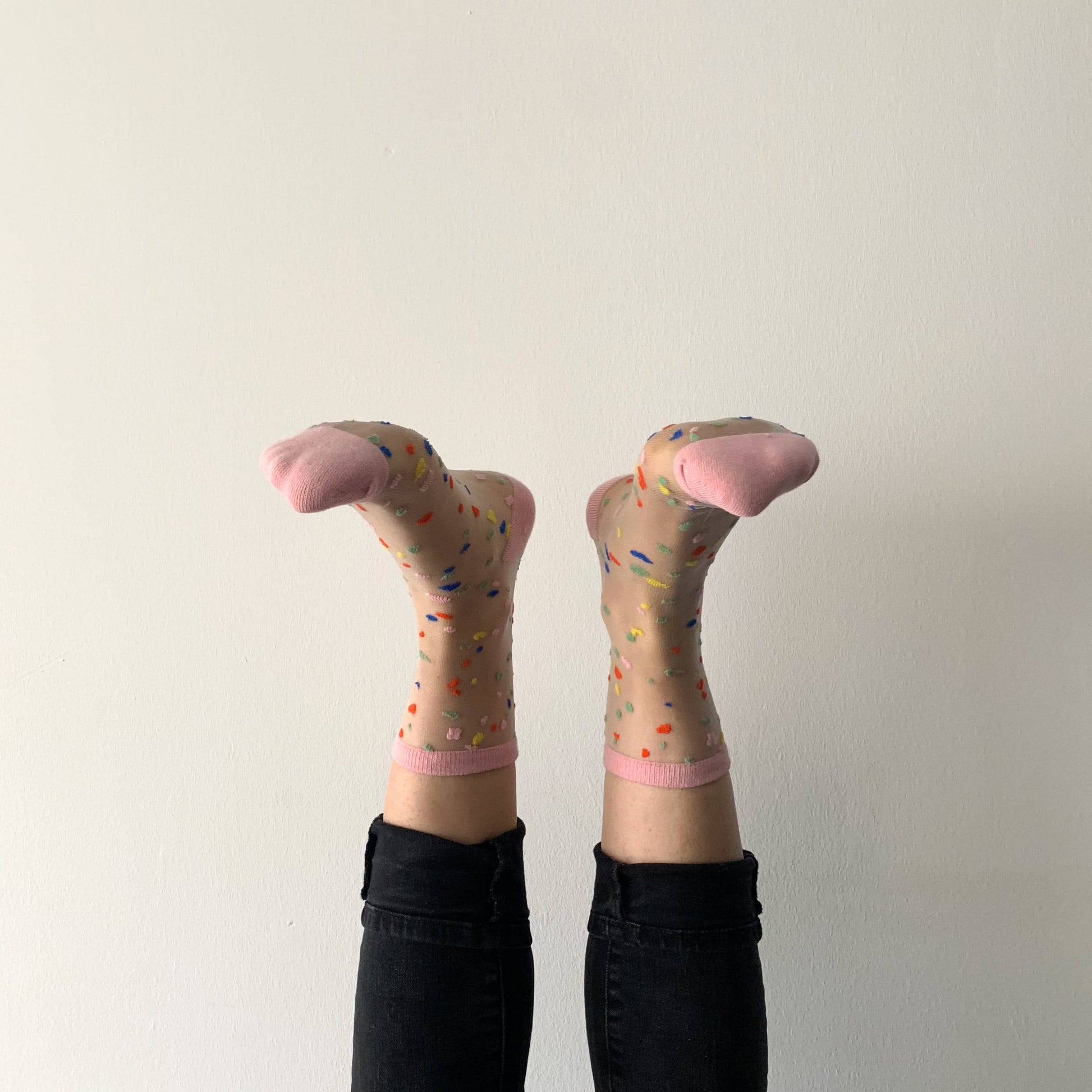 Konfetti-Socken, transparente Socken, Schleier-Socken, Fantasie-Socken, bunt, weißes Rippbündchen, Jahresendfeiern, Geschenkidee, Wichteln, Party, Weihnachten, Herbst Winter, Festtagslook, weiße Turnschuhe, Mary-Jane, Loafers, Damenaccessoire, Impulskauf