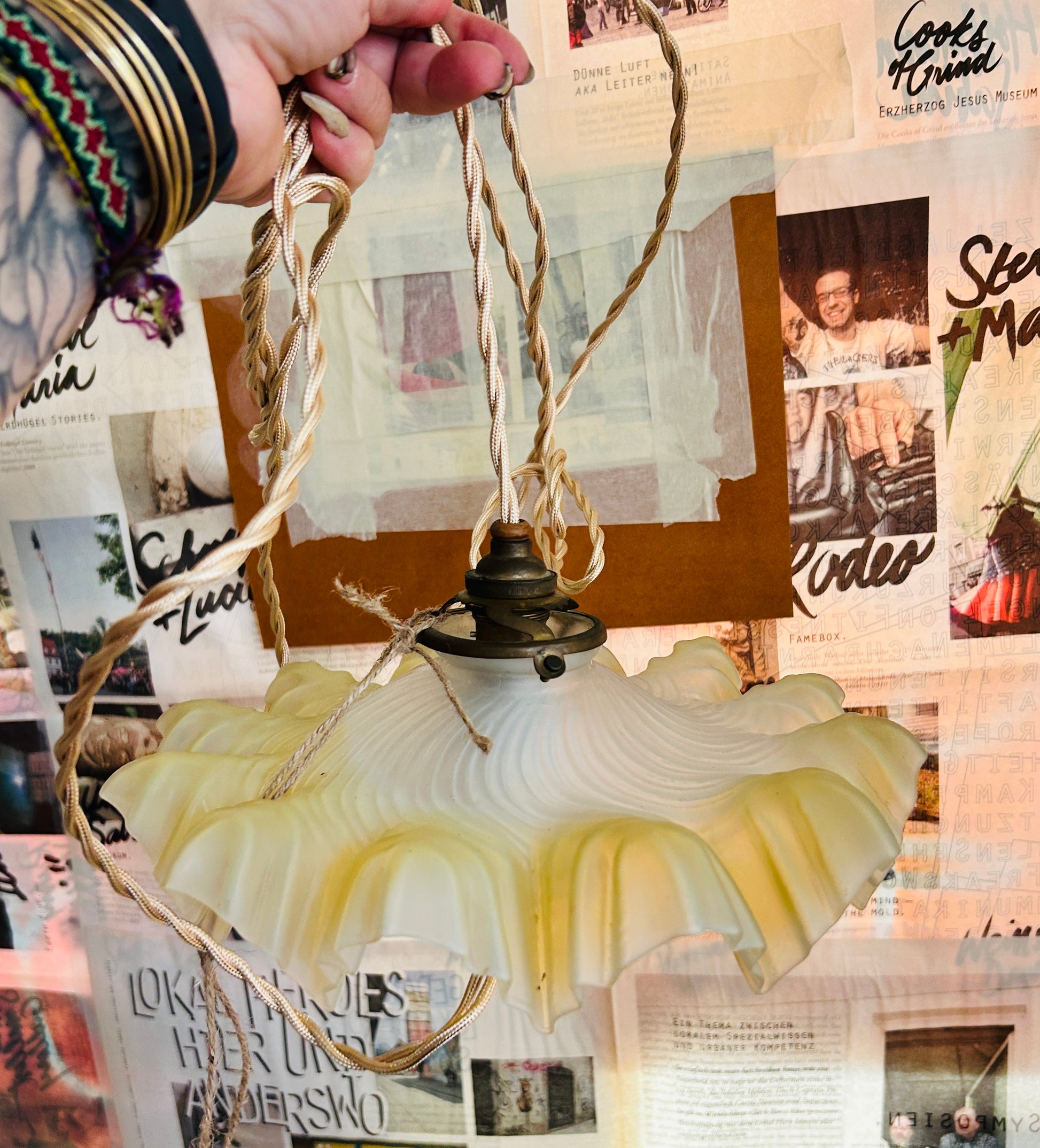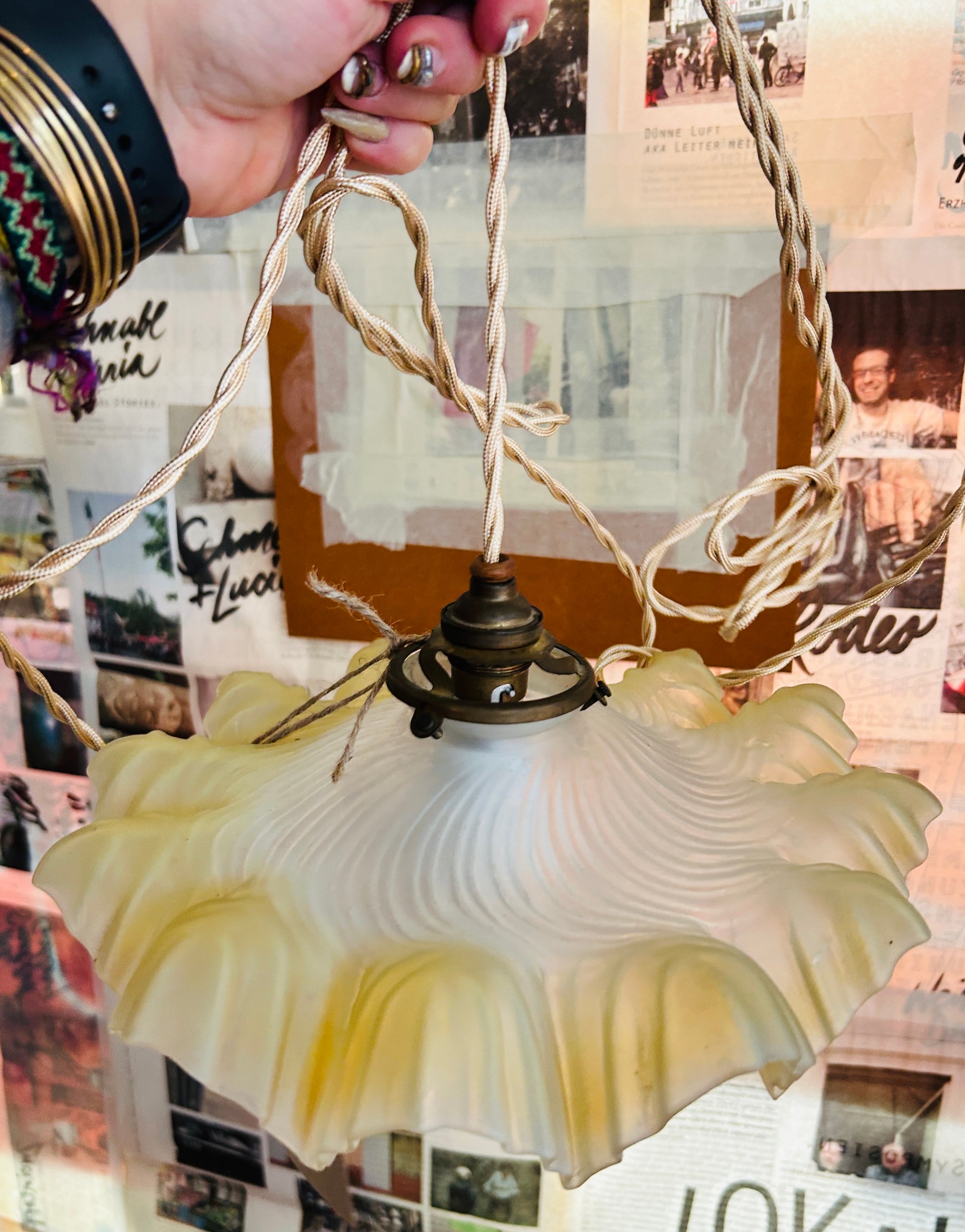 Wir haben diese bezaubernde hellgelbe Pendelleuchte in der Nähe von Lyon in Frankreich, in einem kleinen Dorfladen erstanden, in dem lokale Produzentinnen ihre Produkte verkaufen.