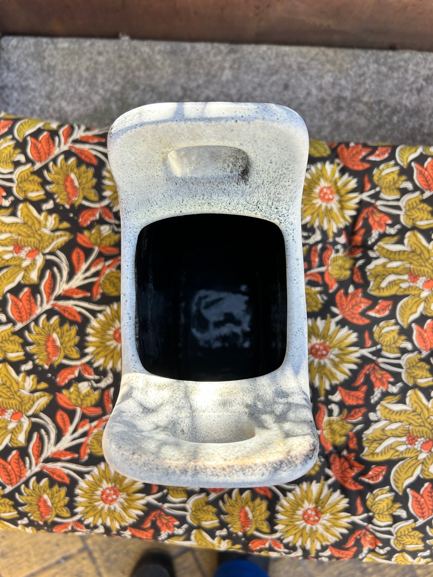 Fantastische große Mid Century Vase von Dümler und Breiden. Das Besondere ist nicht nur das anmutende Fat Lava Decor aus der Serie „POLAR“ sondern vor allem die Form: zwei Griffe rechts und links lassen eine Einkaufstasche anmuten. 30cm hoch. Sehr guter Vintage Zustand